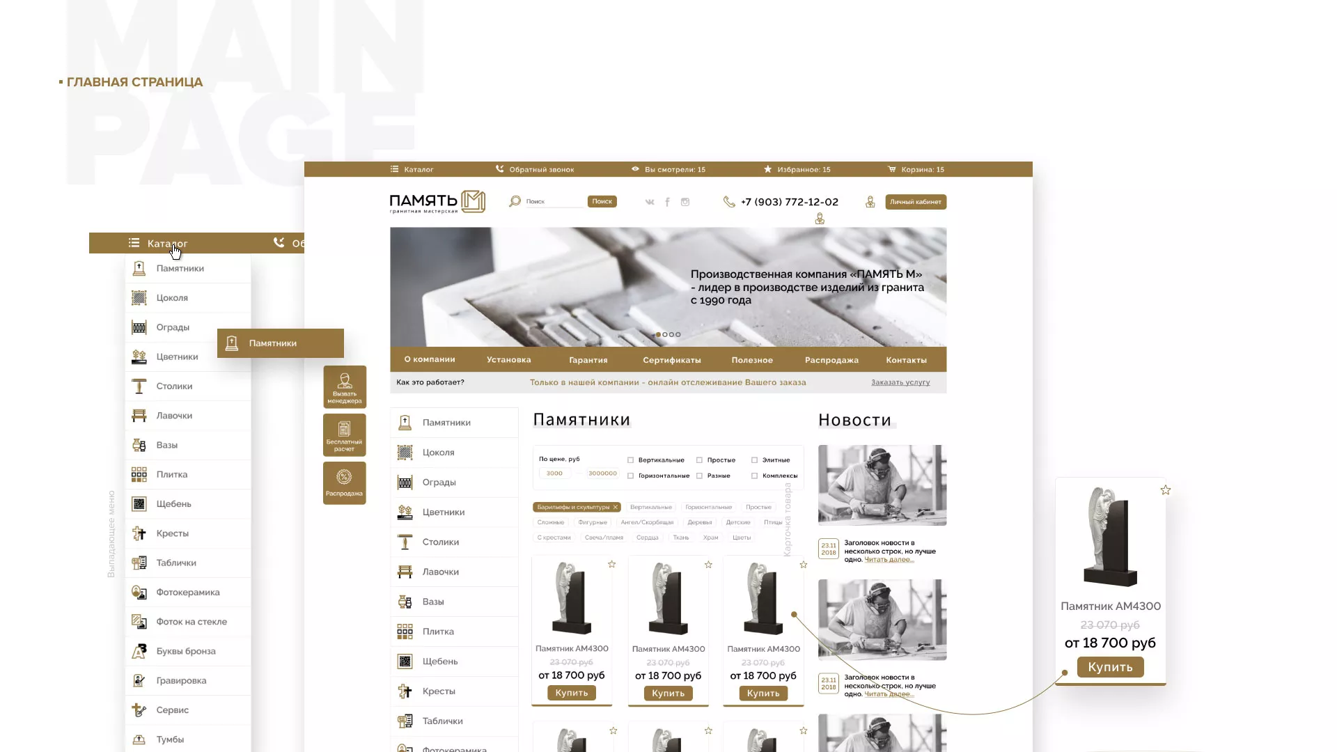 Разработка логотипа, фирменного стиля и сайта в Кондрово для компании «Память-М». Компания является предприятием по изготовлению всех видов надгробных сооружений: памятников, цоколей на могилу, оградок, столов, лавочек, ваз, балясин, плитки, мемориальных комплексов. Компании «Память-М» изготавливает все виды мемориальных изделий на собственном производстве в Кондрово.